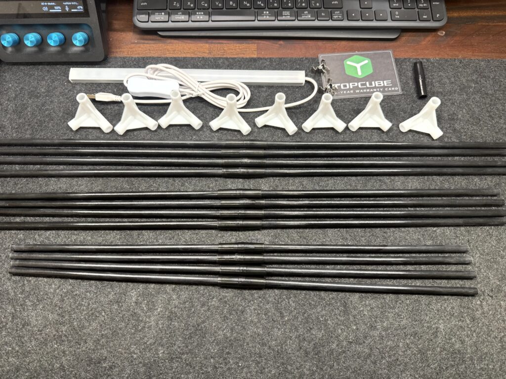 まず箱を開け、同梱されているパーツをすべて確認します。フレーム用の棒、耐熱カバー、LEDライトストリップ、簡易工具、説明書が入っています。組み立て前に、パーツがすべて揃っていることを確認することが大切です。