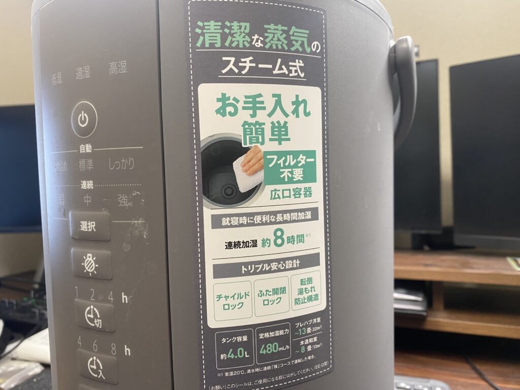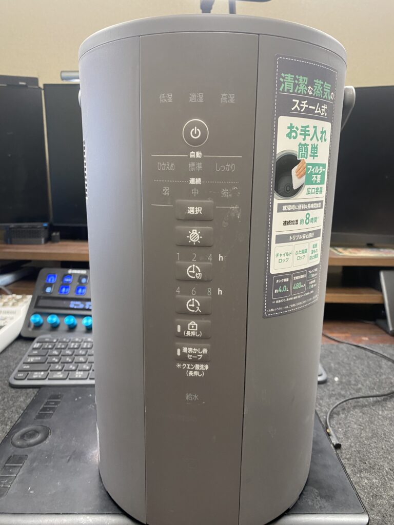 また、温風を吹き出すタイプではないため、風切り音が一切ないのもスチーム式の利点。静音性に関しては超音波式より静かだと感じる場面も多く、仕事環境との相性はかなり良好です。