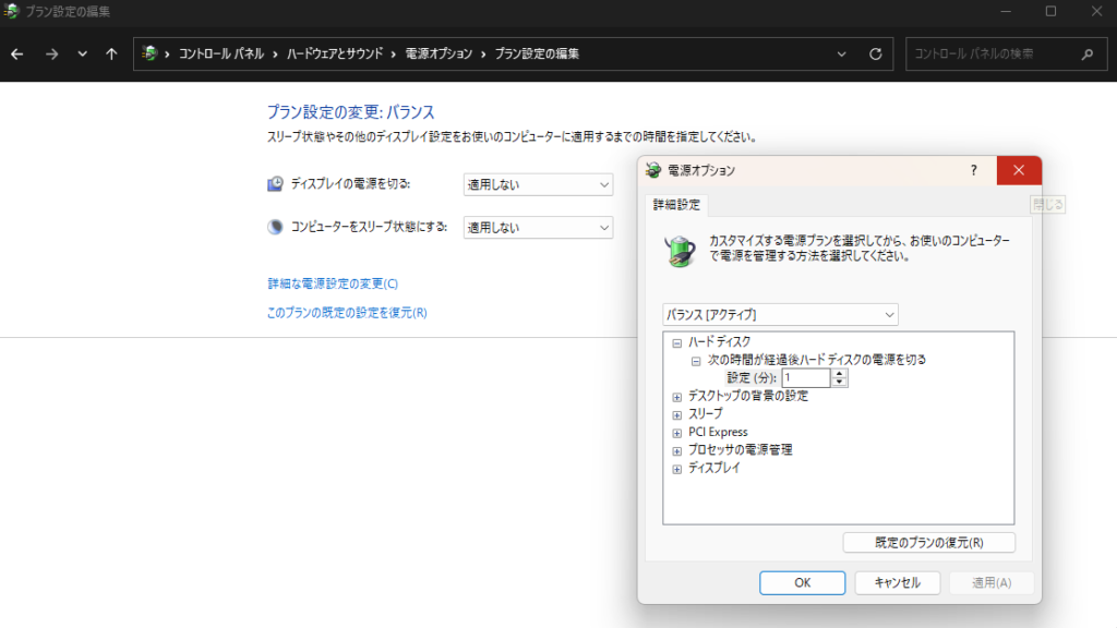 - コントロールパネル > 電源オプション > プラン設定の変更 > 詳細な電源設定の変更。